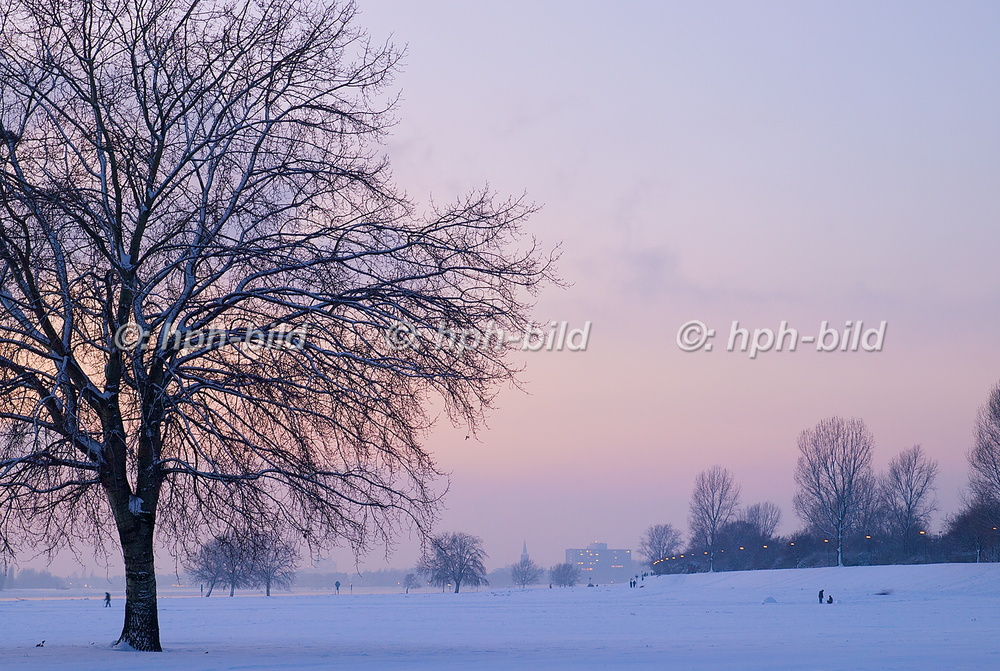 - Abendstimmung, Duesseldorf, Oberkassel, Rheinturm, Rheinwiesen, Schafe, Schnee, Winter